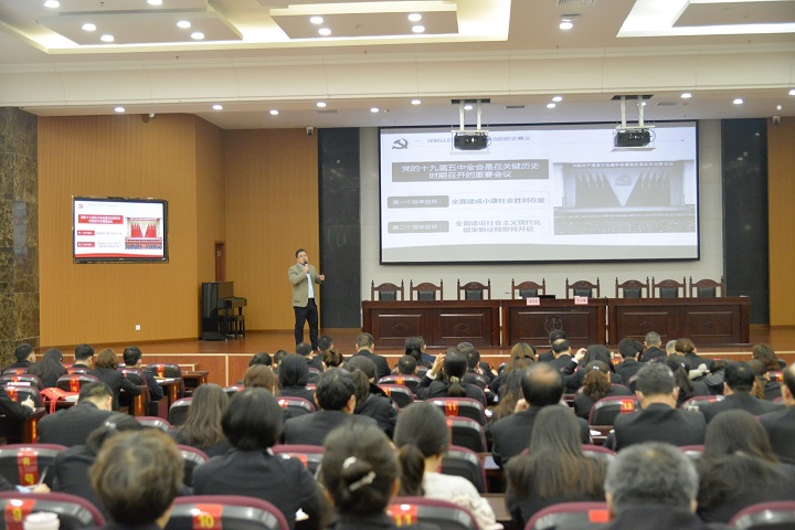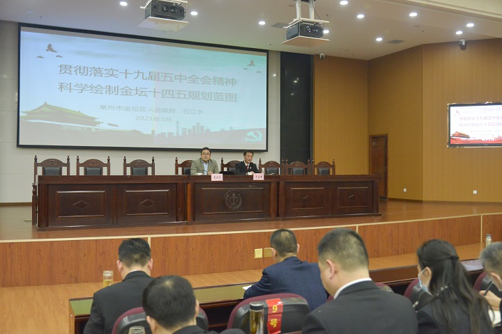 2021年3月27日,金坛法院邀请区委常委、常务副区长石江水作《贯彻落实十九届五中全会精神 科学绘制金坛十四五规划蓝图》专题辅导授课,院党组书记、院长于立峰主持,全体干警参加学习。
