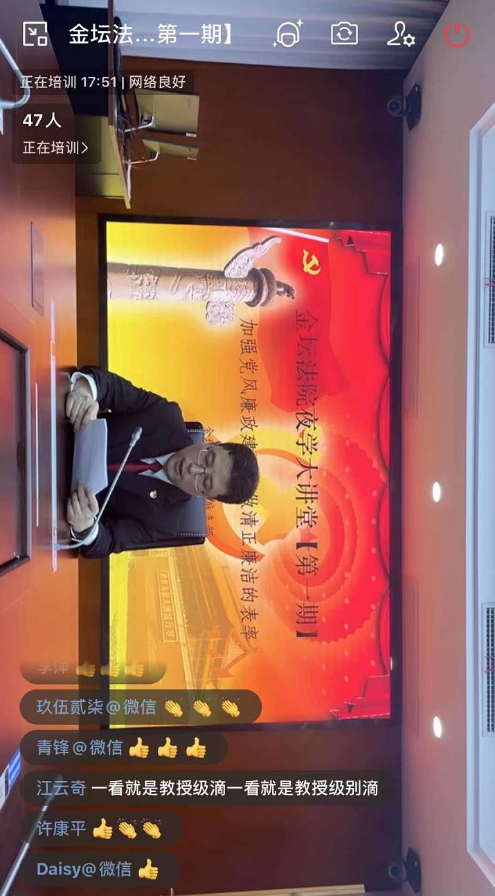 晚上19:00,金坛法院干警一同上线打卡签到,观看王建军同志授课,精彩之处,干警们纷纷点赞评论。