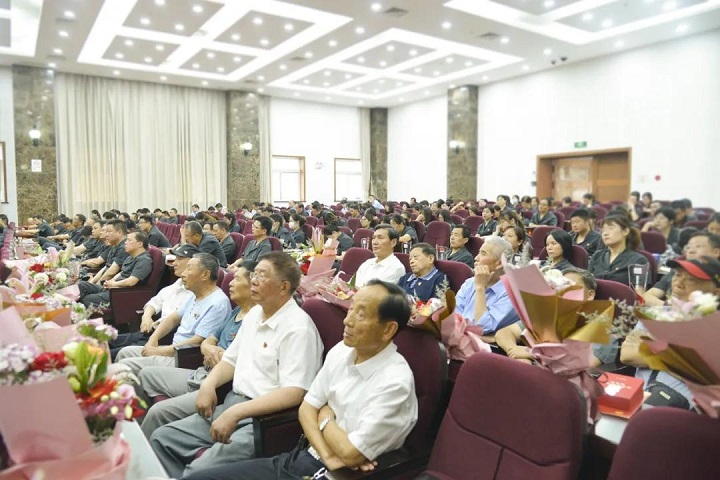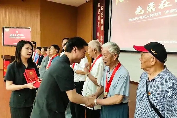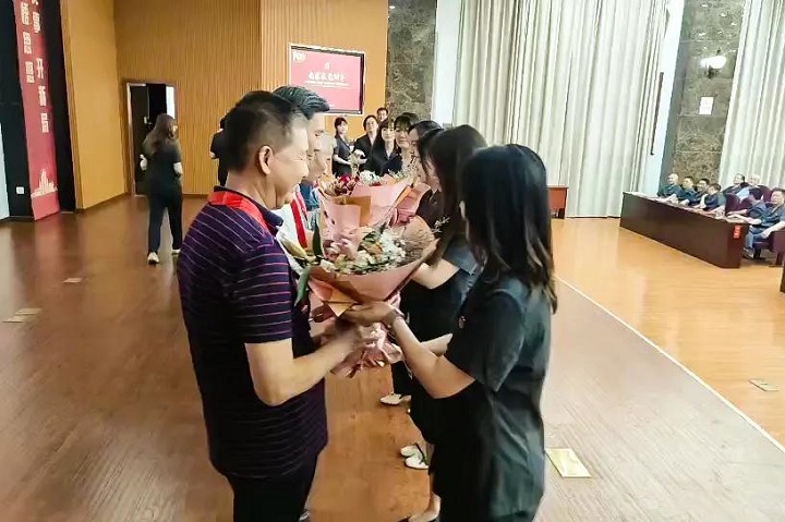 院党组书记、院长于立峰为“光荣在党50年”获得者颁发纪念章,青年干警为离退休老党员代表献花。