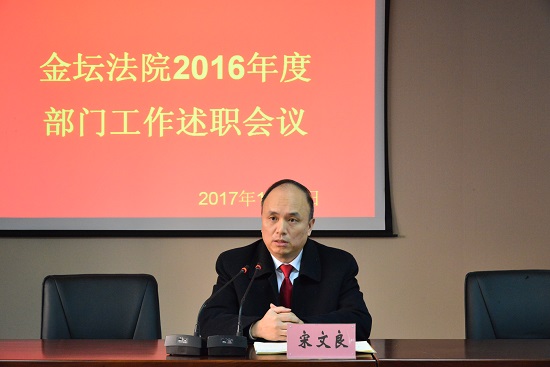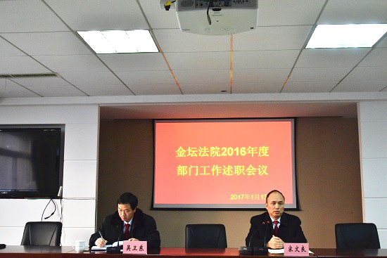 1月13日下午,金坛法院召开2016年度部门工作述职会议,院领导班子成员及全体中层副职以上干部参加会议,党组成员、政治处主任吴卫东主持会议。