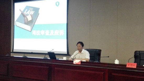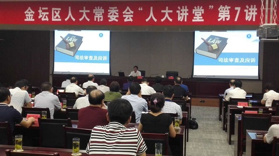 8月15日,应常州市金坛区人大邀请,市中院行政庭庭长孙正才走进常州市金坛区人大常委会“人大讲堂”作了“司法审查及应诉”的专题讲座。讲座中,孙庭长结合多年的行政审判实践经验以及对新《行政诉讼法》学习心得入手,重点阐述了新《行政诉讼法》的实施对行政机关依法行政的影响,从九个方面深入浅出地予以阐释,重在转变理念,提高认识。讲座内容精彩务实,得到了听课人员的一致好评。