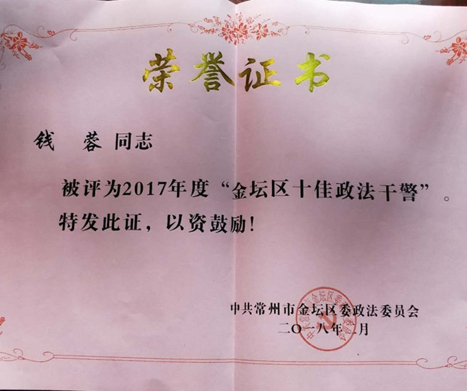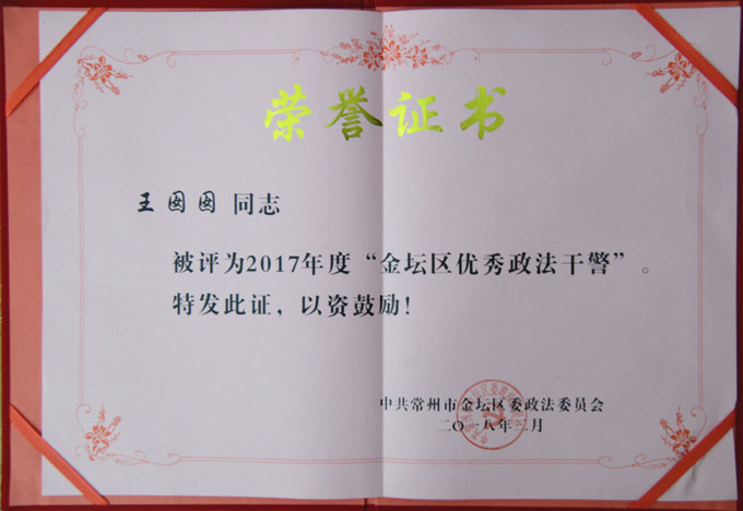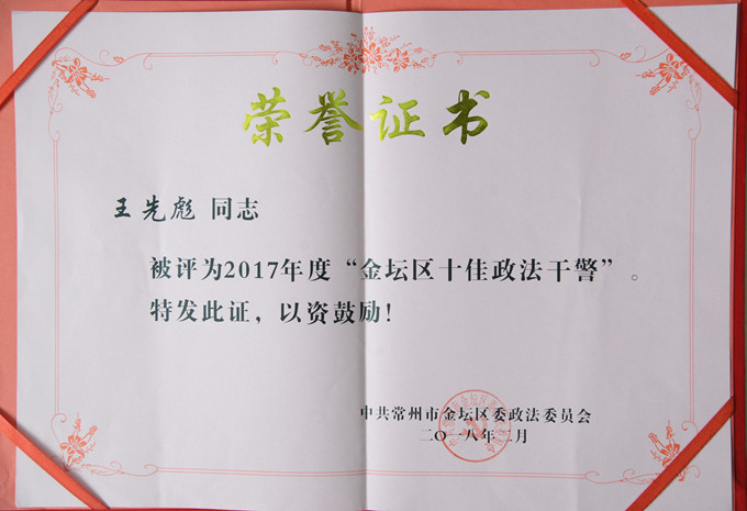 2017年,根据金坛区委政法委开展“十佳政法干警”评选活动的通知要求,全区政法各部门严格按照民主推荐、层层筛选、公开公示等程序,确定了40名候选人。区委政法委通过《金坛新闻》、“金坛网”和“金坛新闻”微信公众号对候选人事迹进行了集中宣传,并采取网络投票的方式,按照候选人得票数和区“十佳政法干警”评选活动领导小组集体研究,确定了10名金坛区十佳政法干警,10名金坛区优秀政法干警。我院干警钱蓉、王先彪、张照鹏、王囡囡在40名候选人中脱颖而出,最终被评为“金坛区十佳政法干警”“金坛区优秀政法干警”。