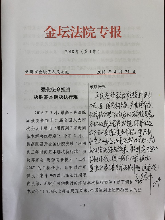 近日,为深入推进“用两到三年时间基本解决执行难”工作,金坛法院向区委、区人大、区政府、区政协等部门报送了《强化使命担当决胜基本解决执行难》的专报。区人大主任王跃中在我院报送的专报上作出重要批示,王跃中主任认为,区法院近年来高度重视案件执行工作,在“消化未结案、严管终本案、化解信访案”方面取得了实质性进展,为优化我区营商环境发挥了重要作用。望法制和内司工委在加强监督的同时,大力支持法院综合施策,做到院内院外协同作战、线上线下双轮驱动,坚决打赢“基本解决执行难”攻坚战。