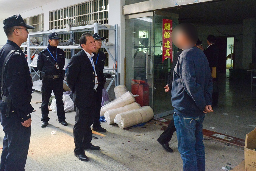干警对仍占用部分厂房不愿意搬迁的某服饰公司经营者释明法律。