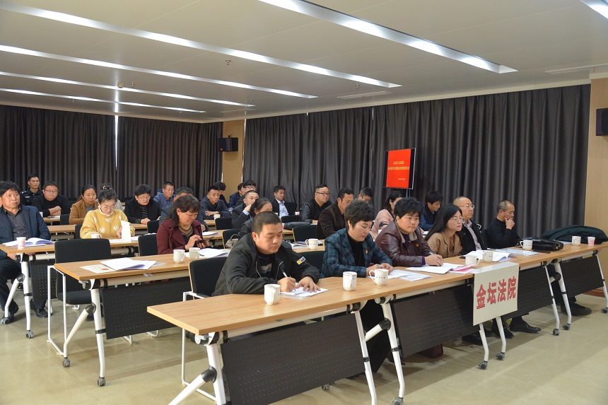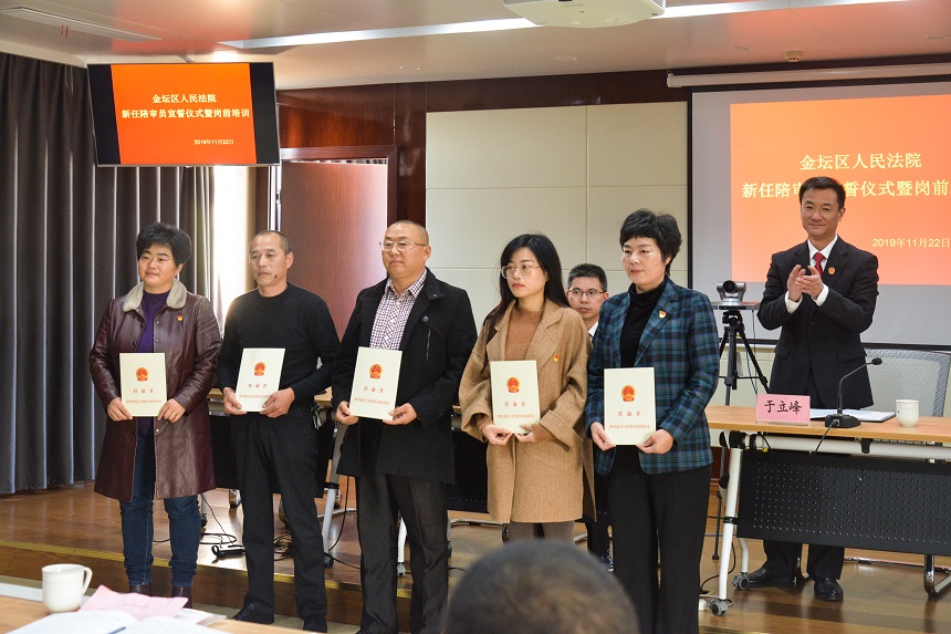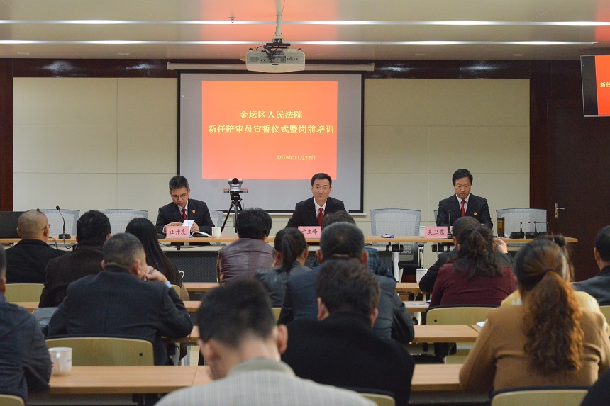 2019年11月22日,金坛法院召开新任陪审员宣誓仪式暨岗前培训。金坛法院党组书记、代院长于立峰、院党组成员、副院长、政治部主任吴卫东、院综合办公室主任汪开友以及37名新任陪审员参加此次活动。