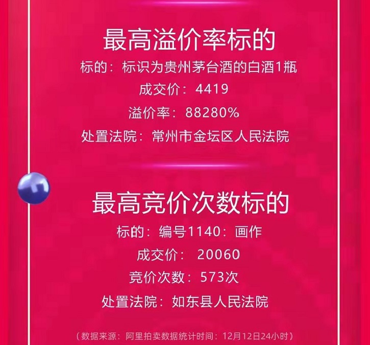 标识为五粮液的白酒2瓶(2004年)拍卖成交价为3720元,标识为五粮液的白酒3瓶(2011年)拍卖成交价为4164元。标识为十年五粮液的白酒1瓶(2005年)拍卖成交价为1908元。标识为贵州茅台酒的白酒1瓶(2009年)、标识为习酒的白酒40箱也参加了淘宝双十二司法拍卖活动。其中,标识为贵州茅台酒的白酒1瓶(2009年)以4419元成交,成为江苏法院2019阿里拍卖双十二中最高报名人数、最高溢价率标的。