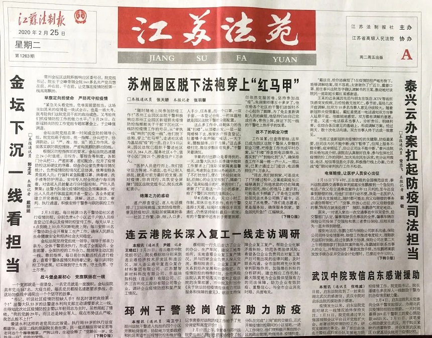 2020年2月25日的《江苏法制报》江苏法苑专栏刊登了金坛区人民法院党员干部深入社区开展联防联控工作的专题报道《金坛下沉一线看担当》。