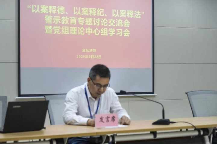 2020年5月22日,金坛法院召开“以案释德、以案释纪、以案释法”警示教育专题讨论交流会暨党组理论中心组学习会,院党组成员、区纪委监委派驻法院纪检监察组组长吕双贵主持会议。