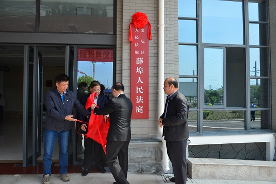 市中级人民法院副院长裴阳、区政法委书记刘东升、我院院长宋文良、茅山管委会党工委书记刘小平共同为薛埠人民法庭揭牌。我院院长宋文良、区政法委书记刘东升、市中级人民法院副院长裴阳分别在揭牌仪式上致辞。