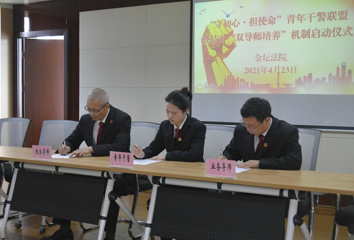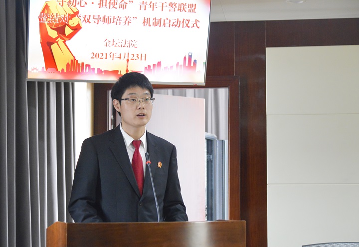 4月23日,五四青年节前夕,金坛法院青年干警齐聚一堂,启动“守初心·担使命”青年干警联盟成立仪式,推行“双导师”培养制,探索青年干警成长“导航”新模式。院党组书记、院长于立峰出席仪式进行授旗并讲话。